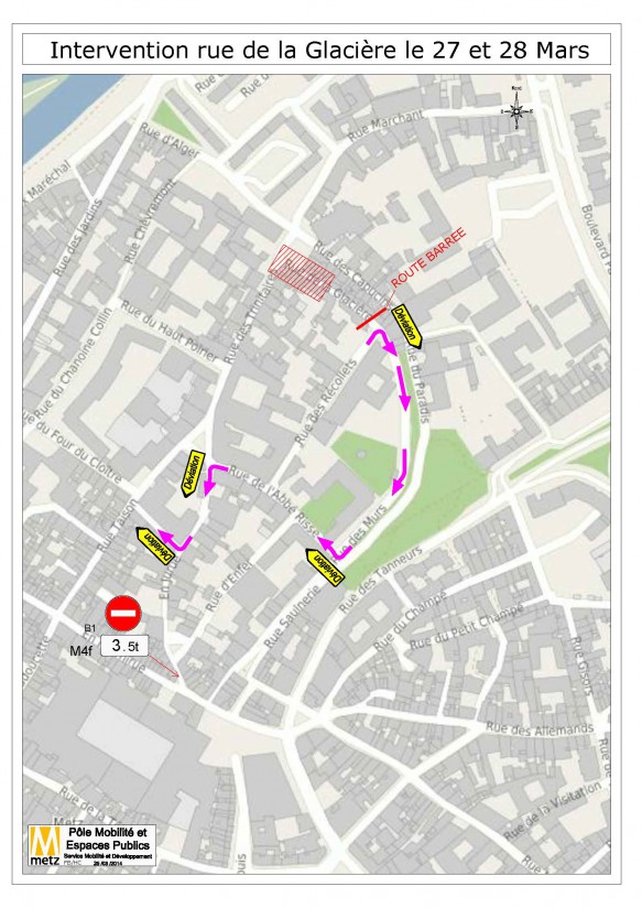 Cette intervention nécessite la fermeture de la rue de la Glacière à la circulation des véhicules, durant deux jours, les 27 et 28 mars. A cette occasion, un plan de déviation est mis en place, afin de maintenir l'accès des véhicules rue des Récollets et la desserte des établissements qui s'y trouvent, l'ensemble scolaire La Miséricorde et la crèche des Récollets notamment.