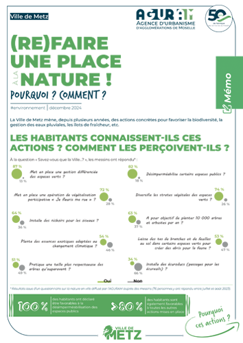 - Une synthèse des résultats de l’enquête diffusée par l’AGURAM, durant l’été 2023, auprès des messins sur leurs connaissances et perceptions des actions mises en place par la Ville de Metz en faveur de la biodiversité ;