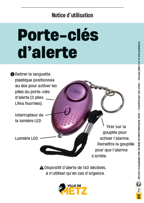 4600 porte-clés d'alerte à destination des Messines seront à nouveau disponibles à compter de lundi 24 mars à l'Hôtel de Ville, dans les mairies de quartier, au Cap ainsi qu'à l'espace SOS Femmes - Suzanne Noël.