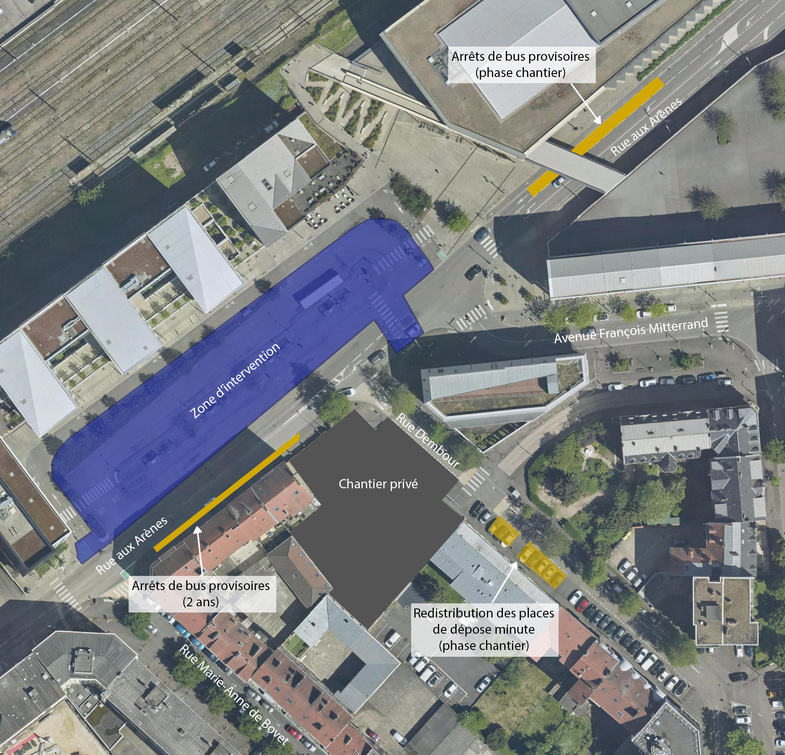 En matière de transport en commun, les arrêts de bus seront réorganisés de part et d’autre de la rue aux Arènes.