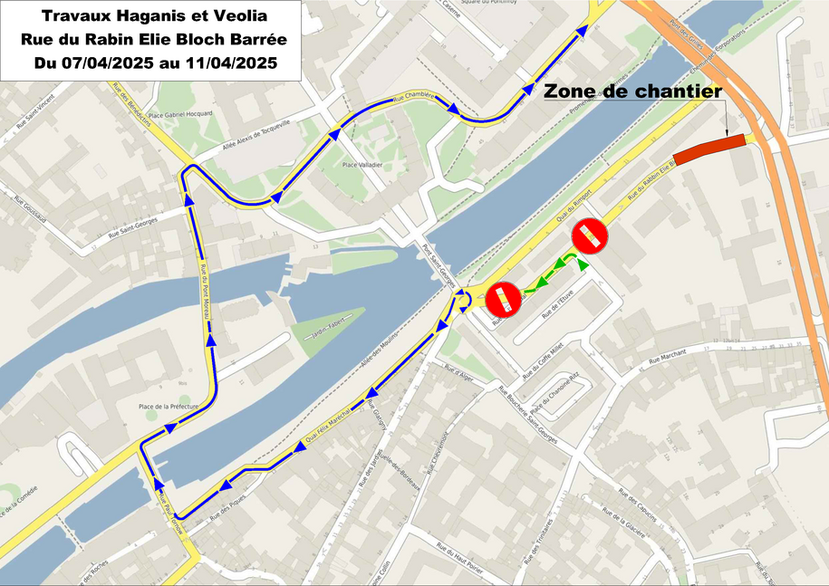 En conséquence, la rue du Rabbin Elie Bloch est interdite à la circulation pendant toute la durée du chantier, avec la mise en place d'une déviation.