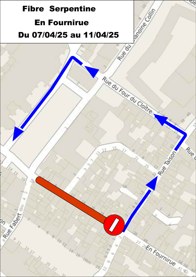 En conséquence, En Fournirue est interdite à la circulation entre la rue Ladoucette et la place d'Armes, durant toute la durée du chantier, avec la mise en place d'une déviation. Les accès piétons des logements et commerces de la rue sont maintenus.