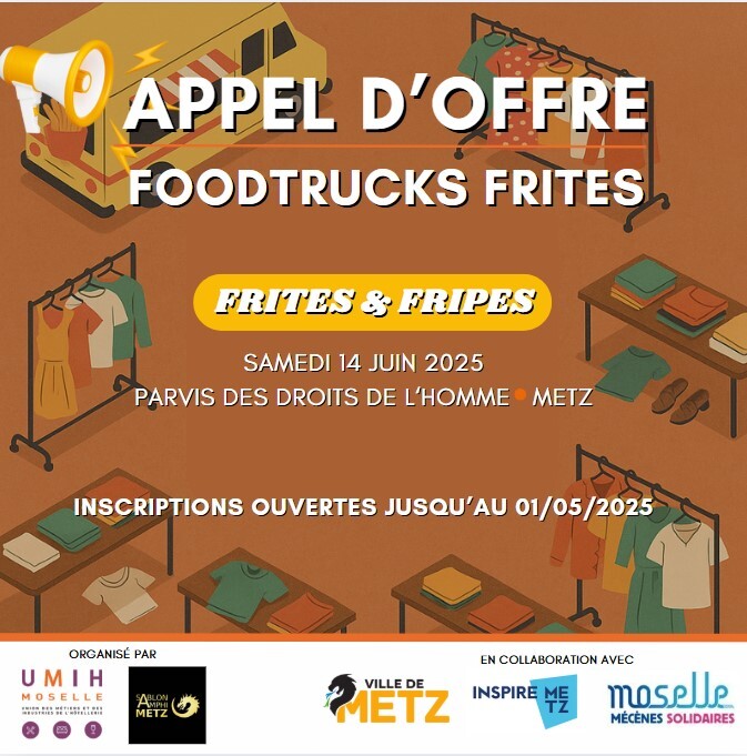 L’UMIH Moselle, en collaboration avec Association des acteurs économiques et commerçants des quartiers de Sablon et Amphithéâtre et soutenu par la Ville de Metz, Inspire Metz et Moselle Mécènes Solidaires, organisent l'événement "Frites & Fripes #1", qui se tiendra le 14 Juin 2025 à Metz, sur le Parvis des Droits de l'Homme. Dans ce cadre, un appel à candidatures est lancé pour trouver des foodtrucks spécialisés dans la frite et ses accompagnements, privilégiant les circuits courts et le fait maison.