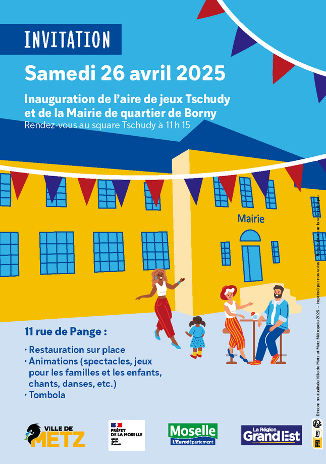 À partir du 28 avril, les habitants du quartier de Borny bénéficieront d'une nouvelle mairie située au 11 rue de Pange. Cette dernière sera inaugurée ce samedi 26 avril à partir de 11h30, précédée par l'inauguration de l'aire de jeux Tschudy à 11h15. De nombreuses animations seront au programme de cette journée festive !