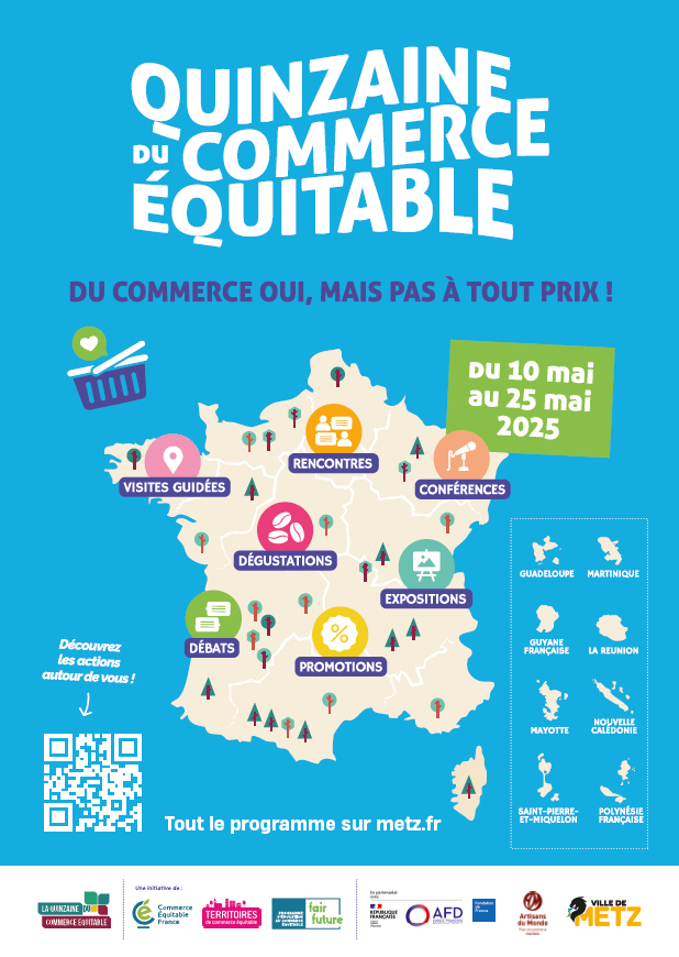 Du 10 au 25 mai, la Ville de Metz, labellisée « Territoire de Commerce Équitable » depuis 13 ans, participe à la Quinzaine du commerce équitable en partenariat avec Artisans du Monde.