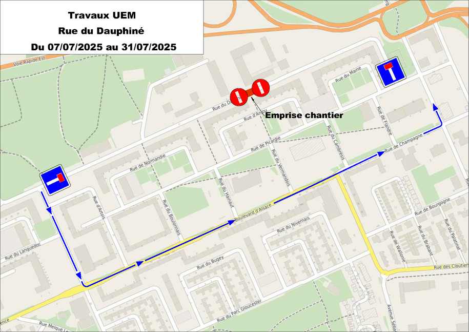 Du 23 juin au 1er août 2025 (sous réserve d'aléas techniques et/ou météorologiques), l'entreprise SOTRAVAL réalise, pour le compte d'UEM, des travaux de rénovation rue du Dauphiné.