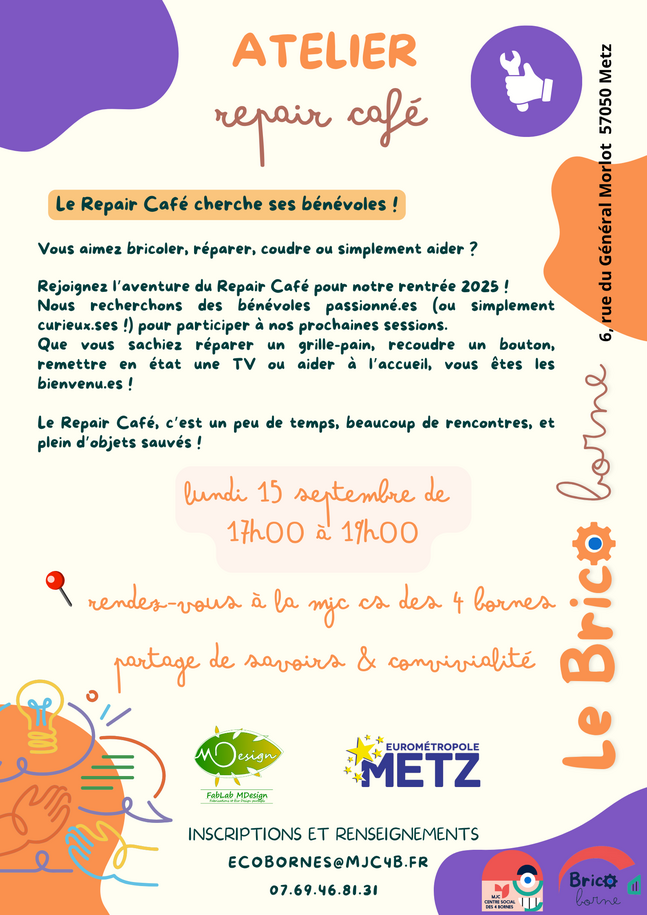 Après le succès des Repair Café organisés à Marly, L'Eurométropole de Metz et l'association M-Design lancent ces RDV à la MJC des 4 Bornes de Metz.