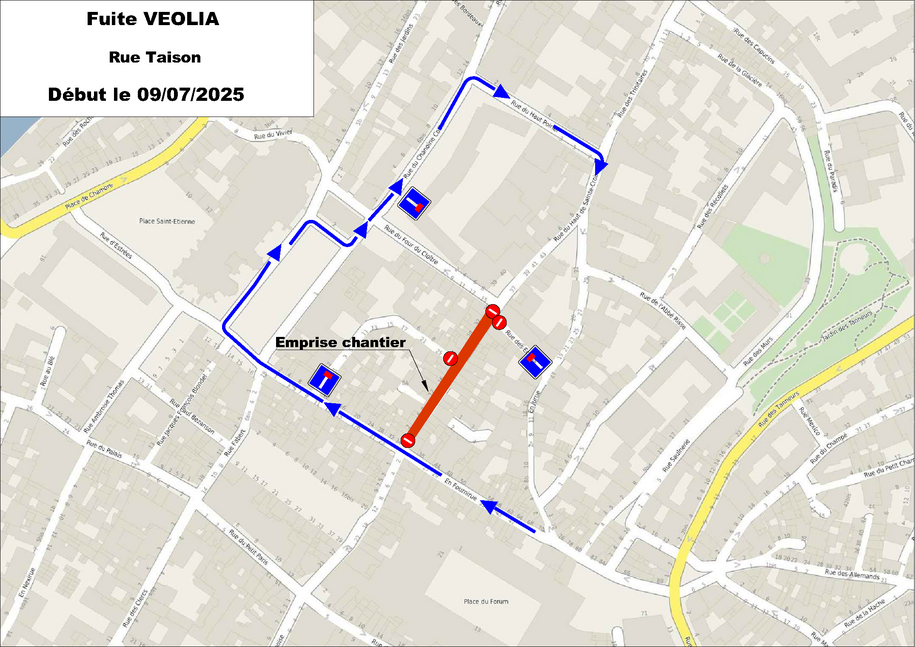 Afin de mener à bien cette opération, la rue Taison est fermée à la circulation durant toute la durée des travaux. Les travaux actuellement menés En Jurue impliquaient une déviation via la rue Taison. Ce plan de déviation est donc également modifié.