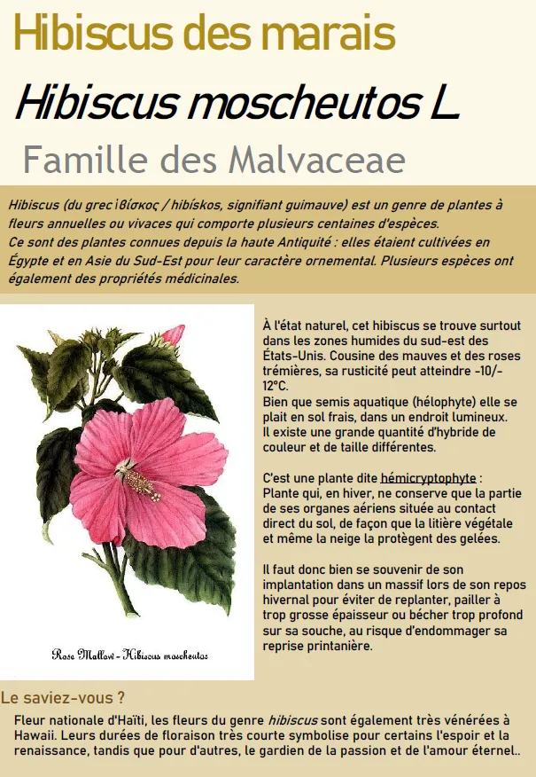 On le trouve actuellement en fleurs devant les serres de collections. Hibiscus (du grec ἱϐίσκος / hibískos, signifiant guimauve) est une plante à fleurs annuelles ou vivaces, cousine des mauves et des roses trémières : sa rusticité peut atteindre -10/-12°C. Ce sont des plantes connues depuis la haute Antiquité : elles étaient cultivées en Égypte et en Asie du Sud-Est pour leur caractère ornemental. Plusieurs espèces ont également des propriétés médicinales.