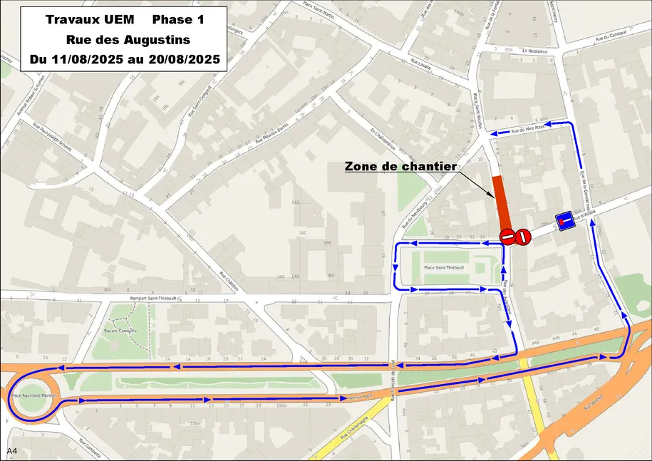 - Première phase - du 11 au 20 août : la rue des Augustins, sur le tronçon compris entre la rue d'Asfeld et la rue du Père Potot, ainsi que la rue d’Asfeld, à son intersection avec la rue des Augustins, sont interdites à la circulation pendant toute la durée du chantier, avec la mise en place d’une déviation