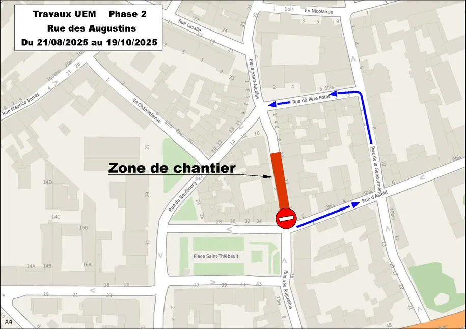 - Deuxième phase - du 21 août au 10 octobre : la rue des Augustins, sur le tronçon compris entre la rue d'Asfeld et la rue du Père Potot, est interdite à la circulation pendant toute la durée du chantier, avec la mise en place d’une déviation.