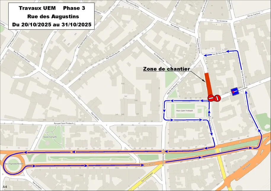 - Troisième phase - du 20 au 31 octobre : la rue des Augustins, sur le tronçon compris entre la rue d'Asfeld et la rue du Père Potot, ainsi que la rue d’Asfeld, à son intersection avec la rue des Augustins, sont interdites à la circulation pendant toute la durée du chantier avec la mise en place d’une déviation.
