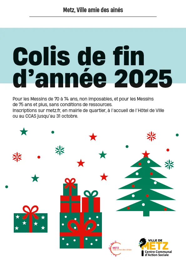 Pour les fêtes de fin d’année, la Ville de Metz et son Centre Communal d'Action Sociale (CCAS) souhaitent apporter une attention particulière à leurs concitoyens les plus âgés. Les Messins de 70 à 74 ans, non imposables, et les Messins de 75 ans et plus, sans conditions de ressources, se verront offrir un colis de fin d'année composé de douceurs salées et sucrées et d’une boisson festive.