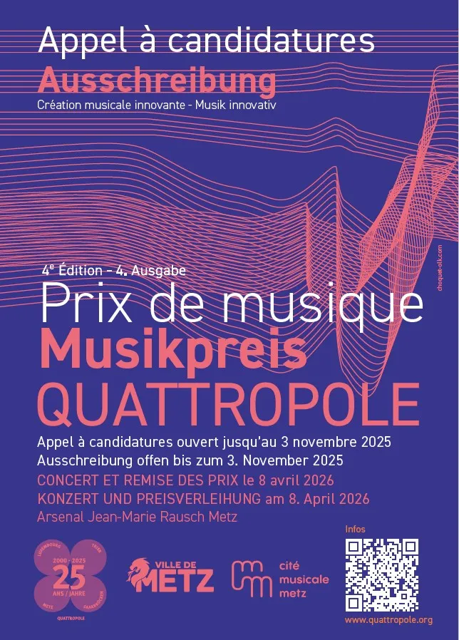 Candidatez pour le Prix de Musique 2026 ! La 4e édition du Prix de Musique est planifiée ! Elle aura lieu le 8 avril 2026 à l'Arsenal Jean-Marie Rausch à Metz. L’objectif du Prix de Musique QuattroPole est la promotion de talents locaux, le renforcement de la mise en réseau transfrontalière des scènes culturelles locales des villes ainsi que l’accroissement de la visibilité du réseau de villes QuattroPole dans la Grande Région et au-delà.