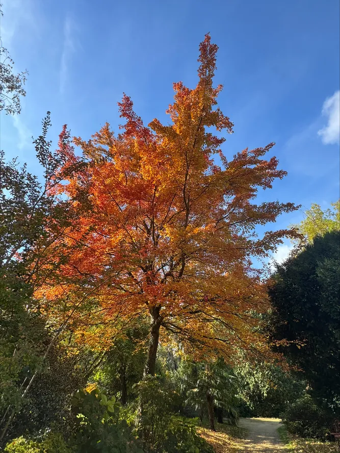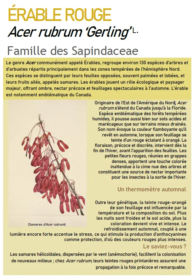 La couleur flamboyante de l'érable rouge fait qu'il se distingue de tous les autres arbres actuellement au Jardin Botanique. Il se situe derrière la rocaille, entre les serres et le Pavillon Frescatelly. Acer rubrum ‘Gerling’ fait partie de la famille des érables, qui regroupe environ 130 espèces d'arbres et d'arbustes. Les érables jouent un rôle écologique et paysager majeur, offrant ombre, nectar précoce et feuillages spectaculaires à l’automne. Originaire de l’est de l’Amérique du Nord, l’érable est notamment emblématique du Canada.