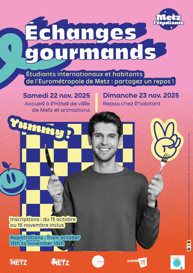 Les Échanges gourmands sont un rendez-vous convivial réunissant, autour d’un repas chez l’habitant, les familles de l’agglomération messine et les étudiants/chercheurs internationaux venus suivre leurs études supérieures à Metz.