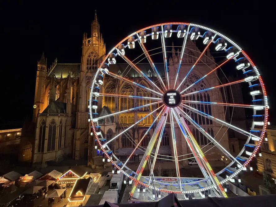 Profitez d'une vue magique sur Metz, ses toits illuminés, sa cathédrale et ses décorations scintillantes depuis la grande roue.