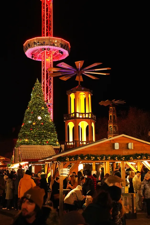 Venez prendre de la hauteur avec le City Skyliner, tour panoramique de 81 mètres qui dévoile une vue à couper le souffle sur la ville. À la tombée de la nuit, les milles et une lumières du grand sapin illuminent la place. Découvrez le savoir-faire local, notamment au chalet Qualité MOSL et aux chalets de Noël solidaires