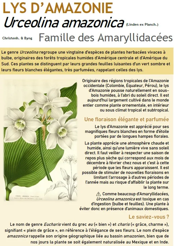 Le lys d'Amazonie se distingue par ses grandes feuilles luisantes d’un vert sombre et ses fleurs blanches élégantes, très parfumées. On le trouve actuellement en fleurs au cœur de la nouvelle serre tropicale du Jardin Botanique. Originaire des régions tropicales de l’Amazonie occidentale (Colombie, Équateur, Pérou), le lys d’Amazonie pousse naturellement en sous-bois humides, à l’abri du soleil direct. Il est aujourd’hui largement cultivé dans le monde entier comme plante ornementale, en intérieur ou sous climat tropical et subtropical.