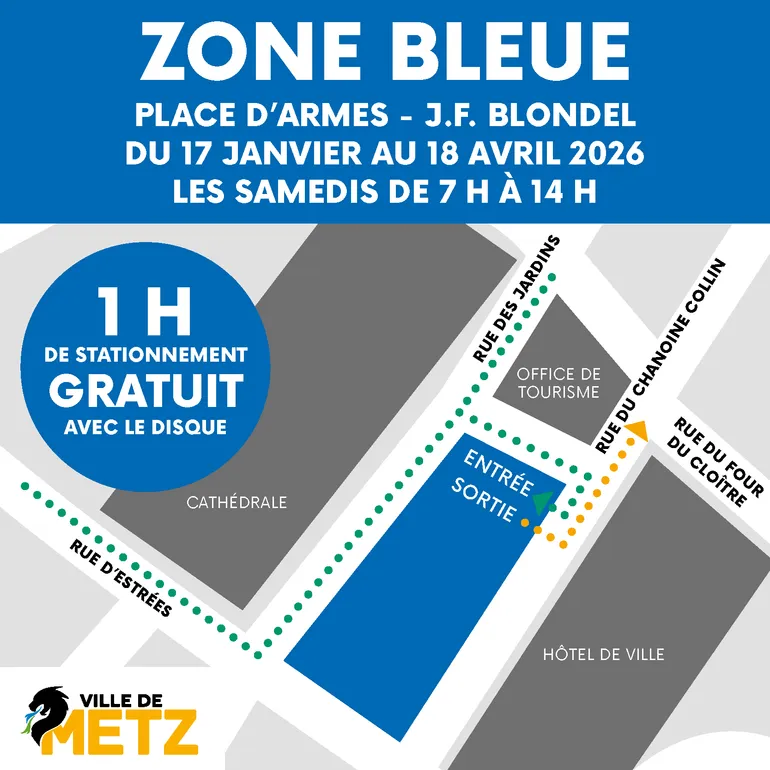Du 17 janvier au 18 avril 2026, la Ville met en place un dispositif de stationnement gratuit à durée limitée sur la place d'Armes - J. F. Blondel. Cette zone bleue est accessible uniquement les samedis de 7h à 14h. Le stationnement y est limité à 1 heure.