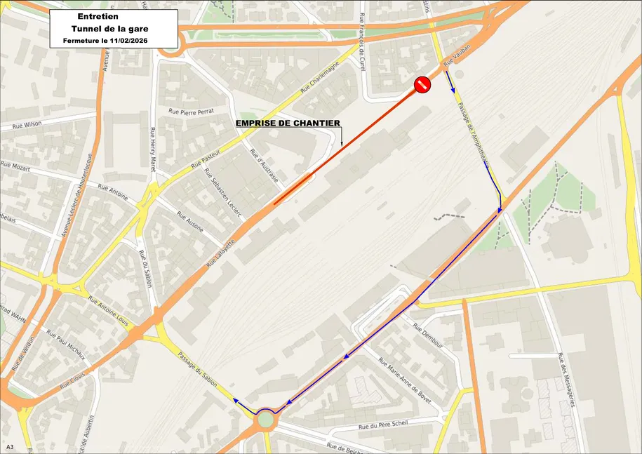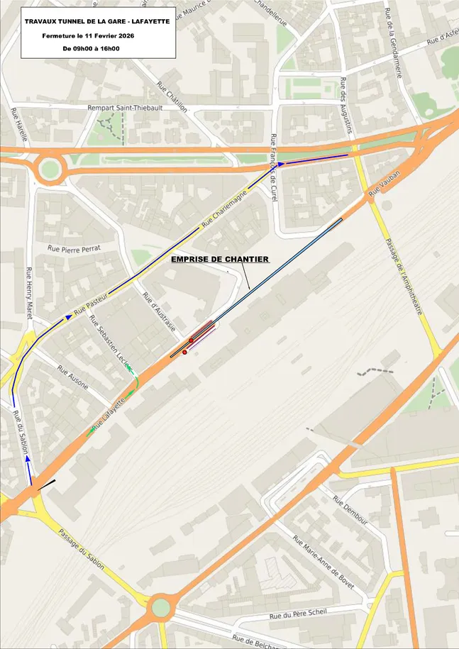 Le 11 février de 9h à 16h se déroulent des travaux d’entretien du tunnel de la gare de Metz , entraînant des perturbations des conditions habituelles de circulation et de stationnement.