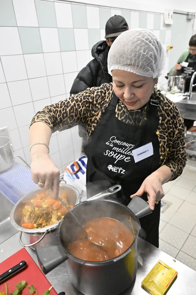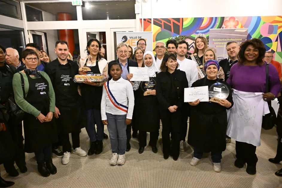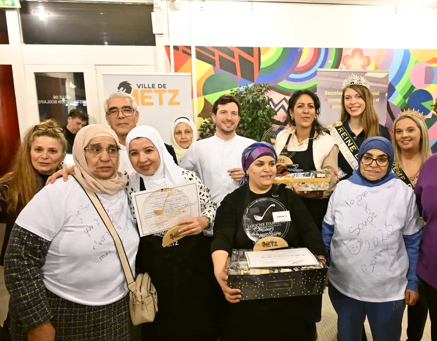La finale de la 3e édition de la meilleure soupe de Metz s'est tenue ce mardi 10 février au lycée professionnel Alain-Fournier. Tous les quartiers de la ville étaient représentés par leurs candidats réunis pour tenter de décrocher le précieux sésame : la Louche d'or ! L'édition 2025-2026 a ainsi sacré Nacira MOKRANI du quartier La Patrotte - Metz Nord et sa chorba algérienne. Elle était accompagnée sur le podium de Majda OSMAN du quartier de Borny (Louche d'argent) et de Anne GOTHIER du quartier Nouvelle Ville – Sainte Thérèse (Louche de bronze).