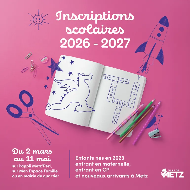 Les inscriptions pour la rentrée scolaire 2026-2027 ont démarré ! Les parents des élèves concernés ont jusqu'au 11 mai pour enregistrer leur enfant, en priorité en ligne sur l'appli mobile Metz'Péri ou via Mon Espace Famille.
