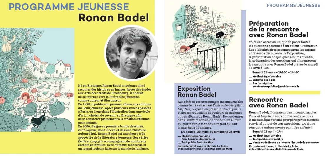 Ronan Badel est par ailleurs l'invité d'honneur jeunesse de cette 39ème édition du festival. Venez à sa rencontre et découvrez son univers sensible et riche qui porte sur le monde un regard qui fait la part belle à l'enfance ! Une exposition "Ronan Badel" est notamment programmée à la médiathèque Verlaine du samedi 28 mars au dimanche 26 avril.