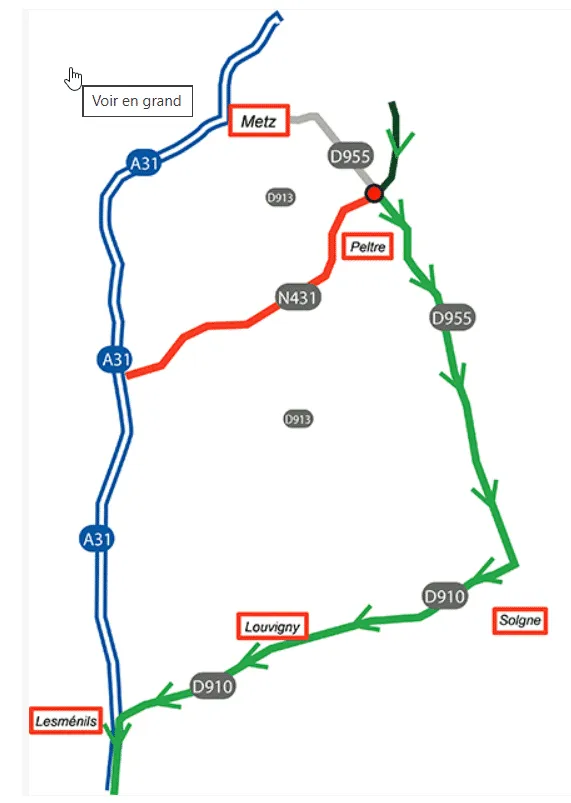 La déviation invitera les usagers à sortir à l’échangeur de Hauconcourt pour suivre l’A4, l’A315, la RN431 puis les M955/D955 et enfin la D910 pour retrouver l’A31 par l’échangeur n°28 de Lesmenils.