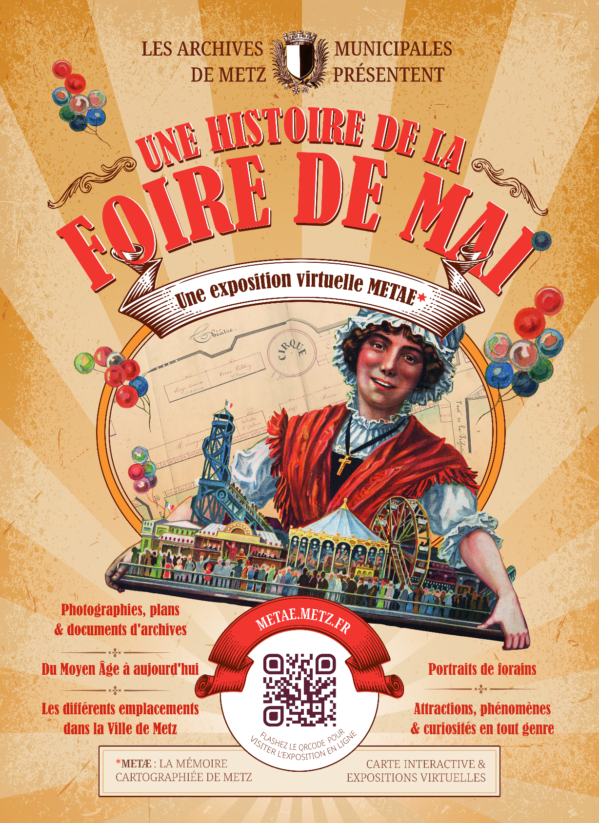Les Archives de Metz retracent l’histoire de la Foire de Mai dans cette nouvelle exposition virtuelle en s’appuyant sur leurs fonds d’archives. Ce service municipal conserve dans ses magasins d'archives, au Cloître des Récollets, des dossiers relatifs à presque toutes les éditions de la foire depuis la fin du XVIIIe siècle. Plans, arrêtés, ordonnances, candidatures de forains, correspondances, affiches et photographies offrent un aperçu détaillé de l’organisation des foires d’antan, de leurs attractions et de l’ambiance vibrante qui les entourait.
