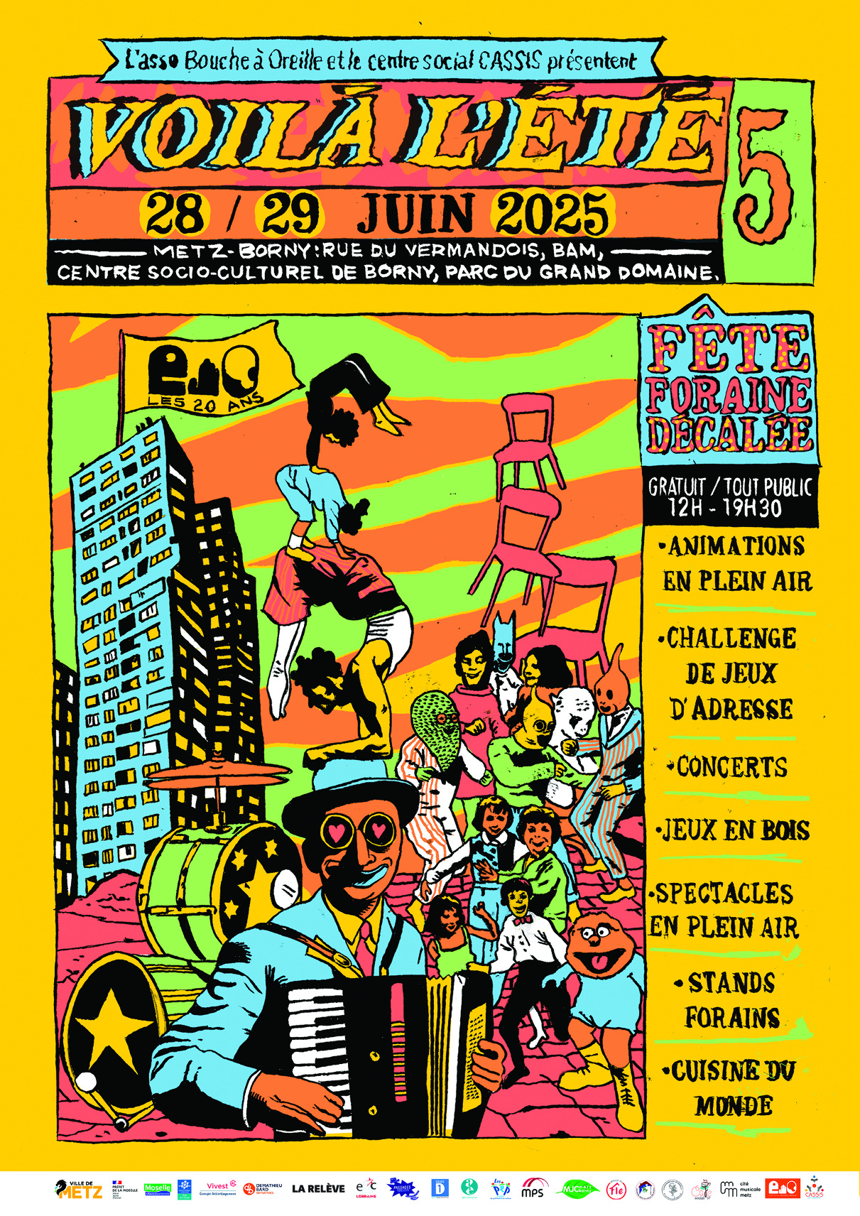 L'Asso Bouche à Oreille et le Centre Cassis présentent Voilà l'été #5 qui se déroulera le samedi 28 et dimanche 29 juin 2025 de 12h à 19h30, rue du Vermandois, à la Bam, au City Stade, au Centre Socioculturel de Borny.