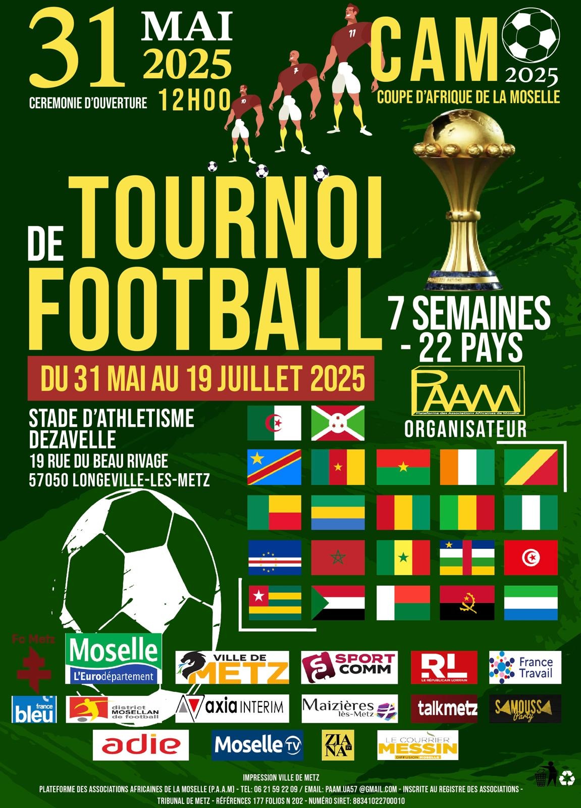 Plateforme des As. Africaines de la MoselleOrganisée par la Plateforme des Associations Africaines de la Moselle (PAAM), la Coupe d’Afrique de la Moselle (CAM) revient pour sa 5ème édition, avec des nouveautés et l’envie de mettre l’Emploi au cœur de l’événement.