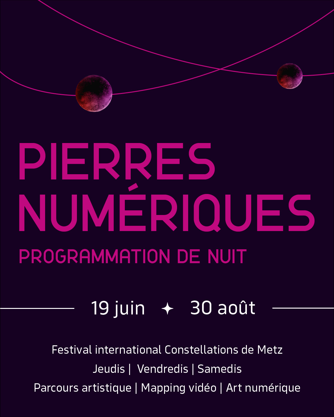 Rythmant la vie culturelle et touristique de Metz et rayonnant au-delà des limites de la cité, Constellations de Metz s’impose comme le rendez-vous culturel inédit, gratuit et incontournable dans le paysage national et transfrontalier. Le festival invite des artistes venus du monde entier à exposer leur univers artistique, tout en accordant une place particulière aux artistes régionaux et locaux. Le festival se décline en deux grands axes : une programmation de nuit autour de l’art numérique, ainsi qu’une programmation de jour autour de l’art urbain.