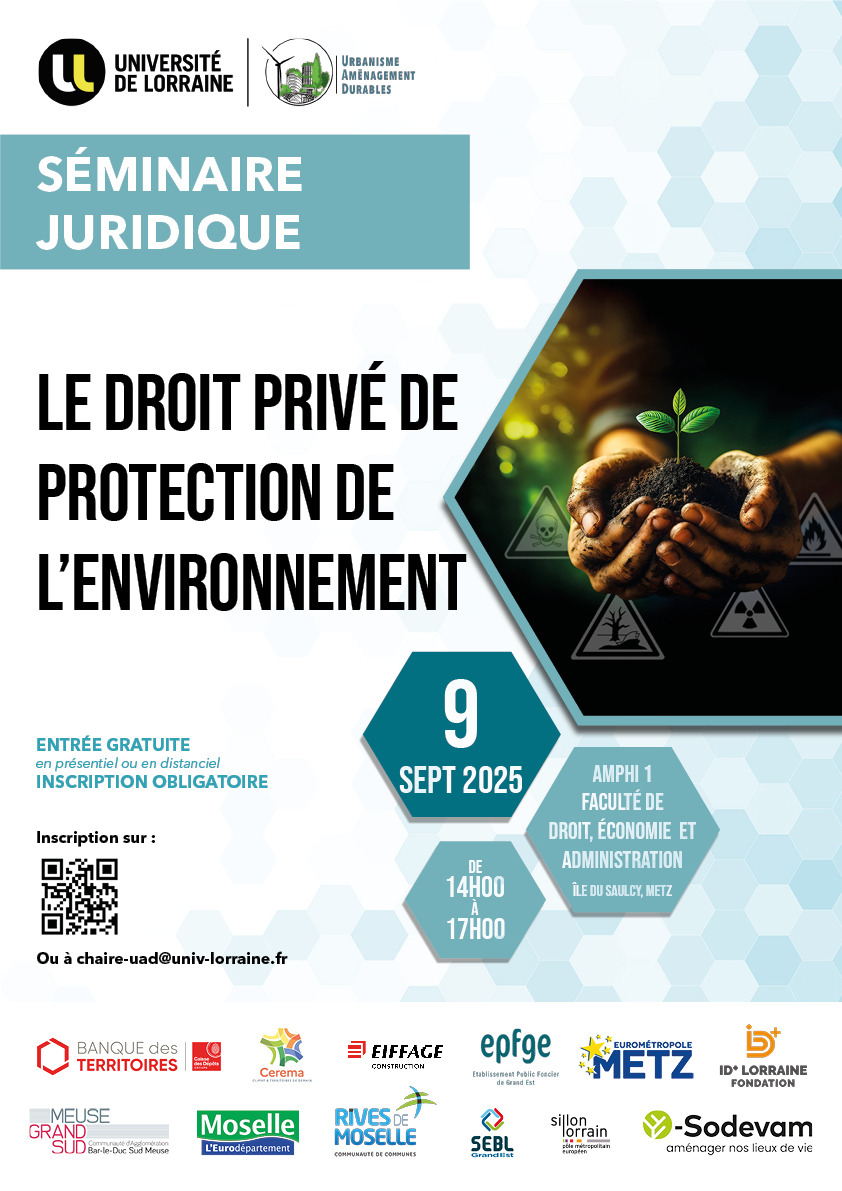 La chaire Urbanisme et Aménagement Durables de l’Université de Lorraine annonce son prochain séminaire juridique, sur le thème « Le droit privé de protection de l’environnement ».
