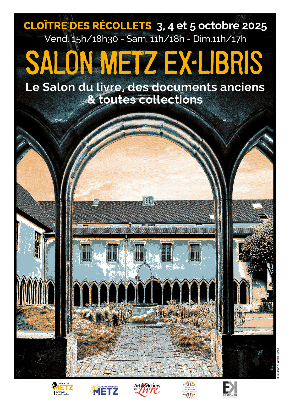 1er Salon Metz Ex- Libris : Salon du Livre, des documents anciens et toutes collections. 30 libraires professionnels, réunis dans un lieu unique au cœur du vieux Metz. On y trouvera une multitude de documents, écrits, imprimés, dessinés, peints ou gravés, de la première édition à nos jours : Livres anciens et d’occasion, manuscrits, estampes, gravures, presse et magazines, bandes dessinées, cartes postales et chromos actions et obligations, affiches publicitaires (de collection et de cinéma), objets cartonnés (décoratifs et de collection), dessins, peinture, photographies, disques…