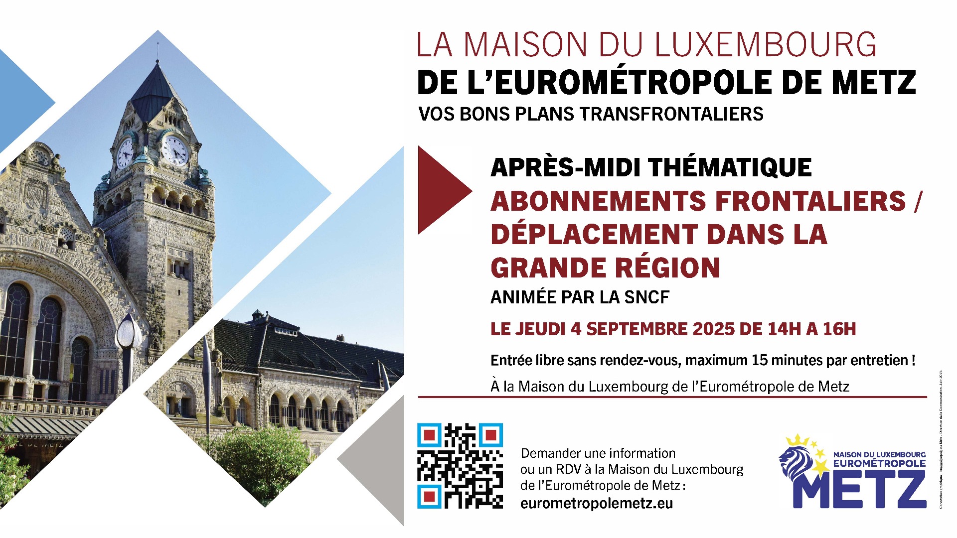 Entrée libre sans rendez-vous, maximum 15 minutes par entretien !La Maison du Luxembourg de l’Eurométropole de Metz organise en partenariat avec la SNCF, un après-midi thématique « Abonnement frontalier / Déplacement dans la Grande Région » le jeudi 4 septembre 2025 de 14h à 16h.