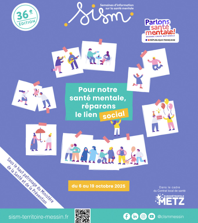 Le Conseil local de santé mentale et ses partenaires ont le plaisir de vous annoncer les Semaines d’information sur la santé mentale (SISM). La manifestation se déroulera du 6 au 19 octobre 2025 en différents lieux du territoire messin. Cette manifestation, temps fort de l’année “Grande cause nationale” , réunit une vingtaine de partenaires qui proposent des événements variés (conférence, ciné-débat, rencontres, etc.) pour parler de santé mentale avec les habitants.
