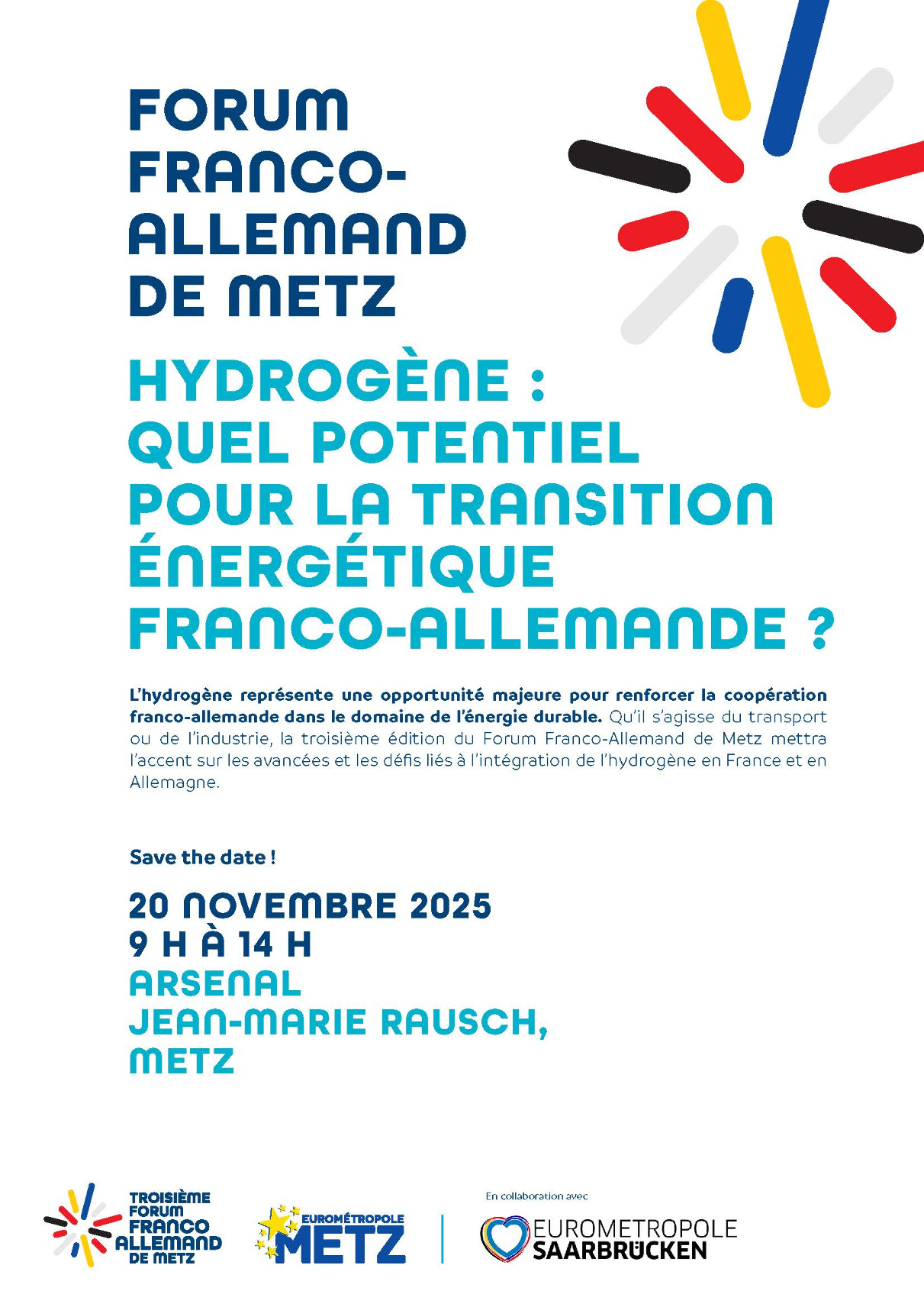 InscriptionLe Forum franco-allemand de Metz revient pour une troisième édition. Après le succès des deux premières éditions consacrées aux villes sur l’eau et à l’industrie automobile, nous réunirons, en coopération avec la Ville de Sarrebruck, les acteurs français et allemand de la filière de l’hydrogène.