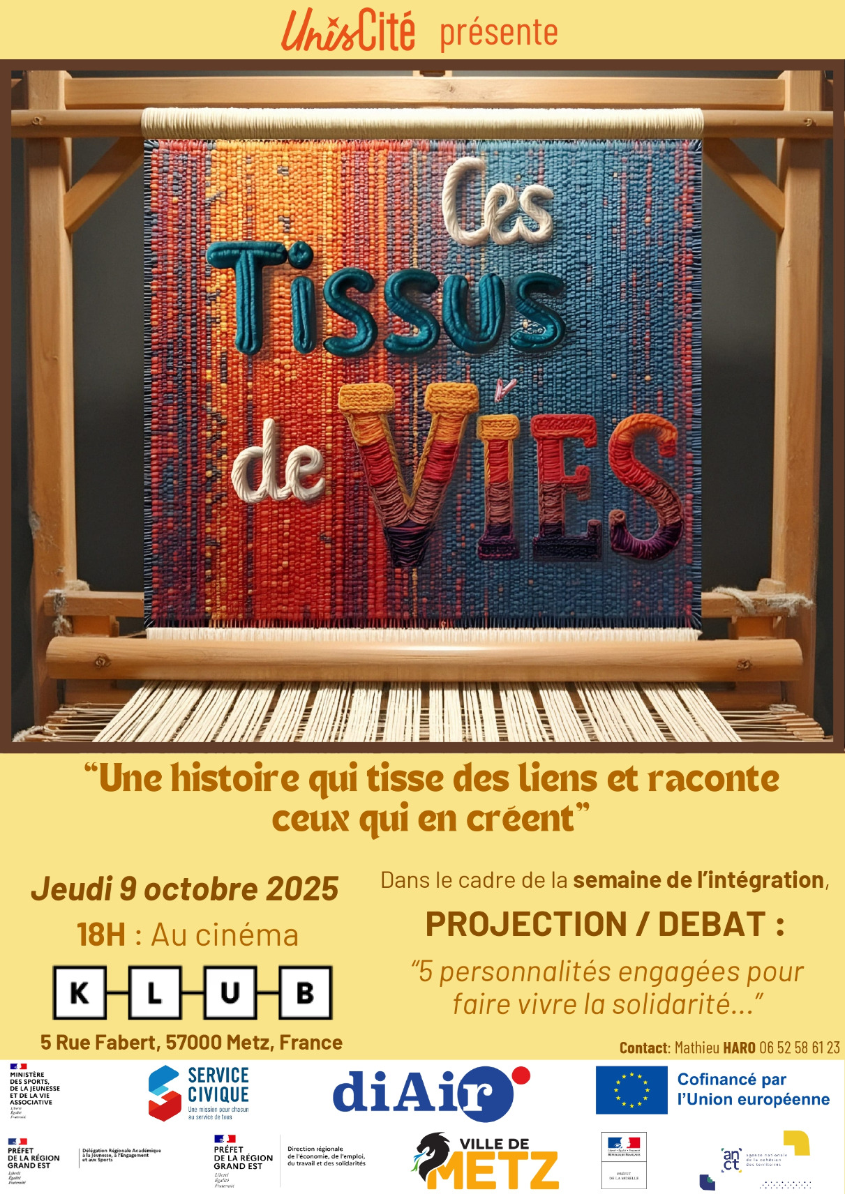 Dans le cadre de la semaine de l'intégration, Unis-Cité Metz propose au public de découvrir son film "Ces Tissus de Vies" réalisé en mai 2025 avec une équipe de volontaires en service civique composée de réfugiés et de francophones.