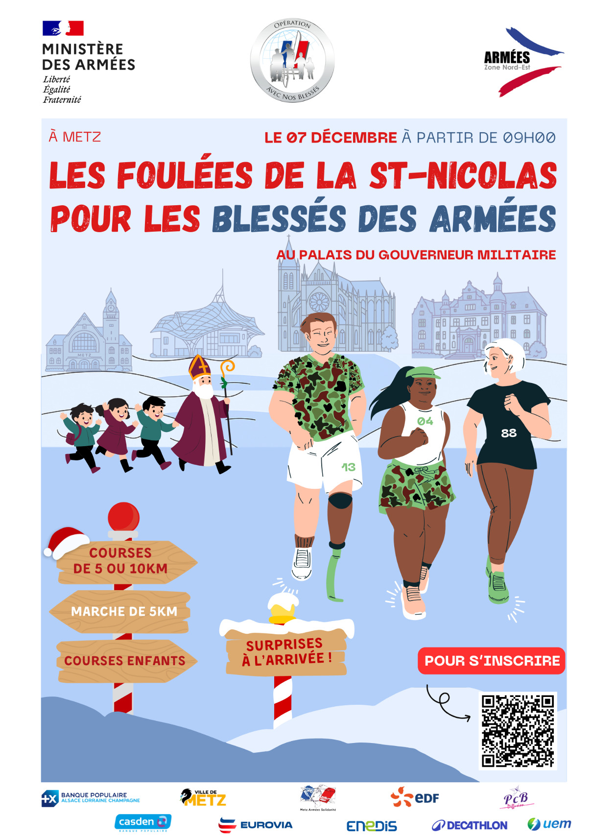 Plus d'informations et inscriptionDans l'esprit de partage et de générosité de la Saint-Nicolas, rejoignez-nous à Metz pour une journée placée sous le signe de la solidarité le dimanche 7 décembre 2025 ! Petits et grands, coureurs ou marcheurs, il y en aura pour tous les goûts : courses de 5 km et 10 km, marche familiale de 5 km ou encore course enfant de 1 km. Ensemble, soutenons les blessés des Armées et leurs familles, et partageons un moment unique dans un cadre festif. Et pour finir en beauté, des surprises vous attendent au village d’arrivée au Palais du Gouverneur Militaire ! Alors, prêts à relever le défi ?