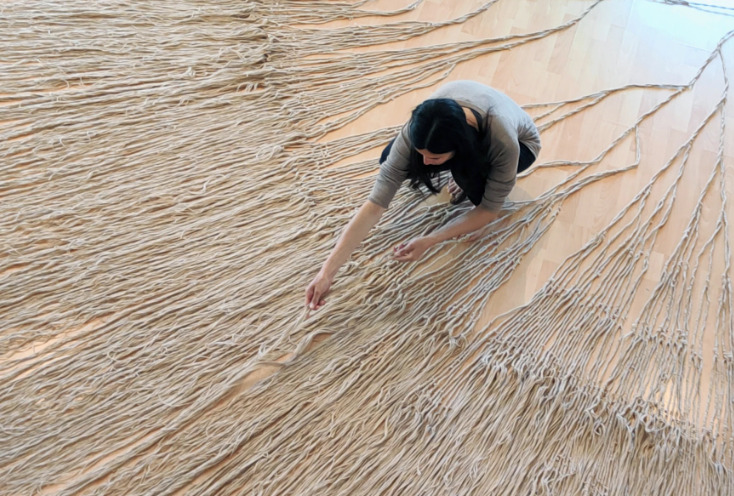 Entre danse et manutention, les gestes étendent la corde, suivent sa logique, parcourent chaque section, ouvrent chaque embranchement. Depuis la corde ramassée sur elle-même, une arborescence s’esquisse, se précise et se densifie, devient finalement un sol.