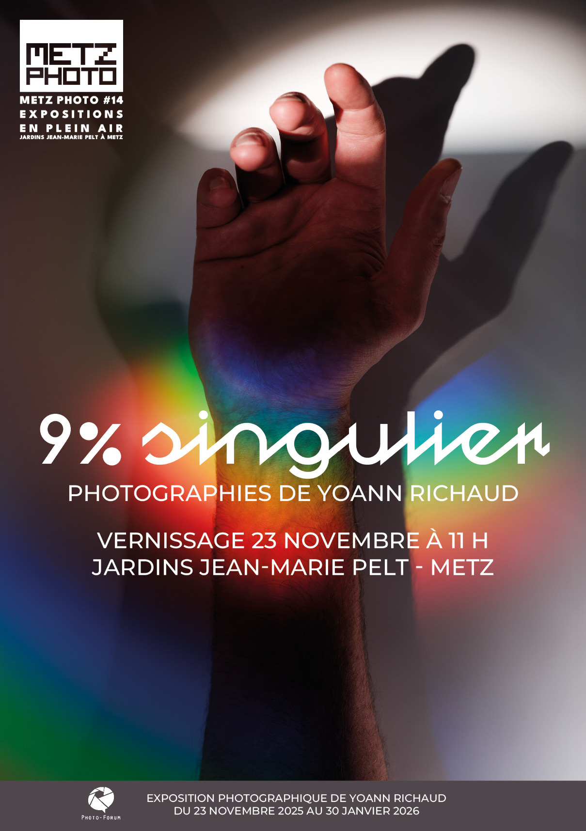 Photo-ForumLa nouvelle exposition de Metz Photo sera présentée aux Jardins Jean-Marie Pelt à Metz du 23 novembre au 30 janvier. Au sein de la masterclass organisée par Photo-Forum, Isabelle Chapuis notre marraine invite les participants dans ce cycle annuel sur le thème “Autoportrait, portrait du soi” à se mettre en récit dans une production intime et introspective. Pour ce troisième volet, Yoann Richaud nous présente "9% singulier". Il vous attend pour le vernissage avec l'équipe de Photo-Forum le dimanche 23 novembre à 11h.