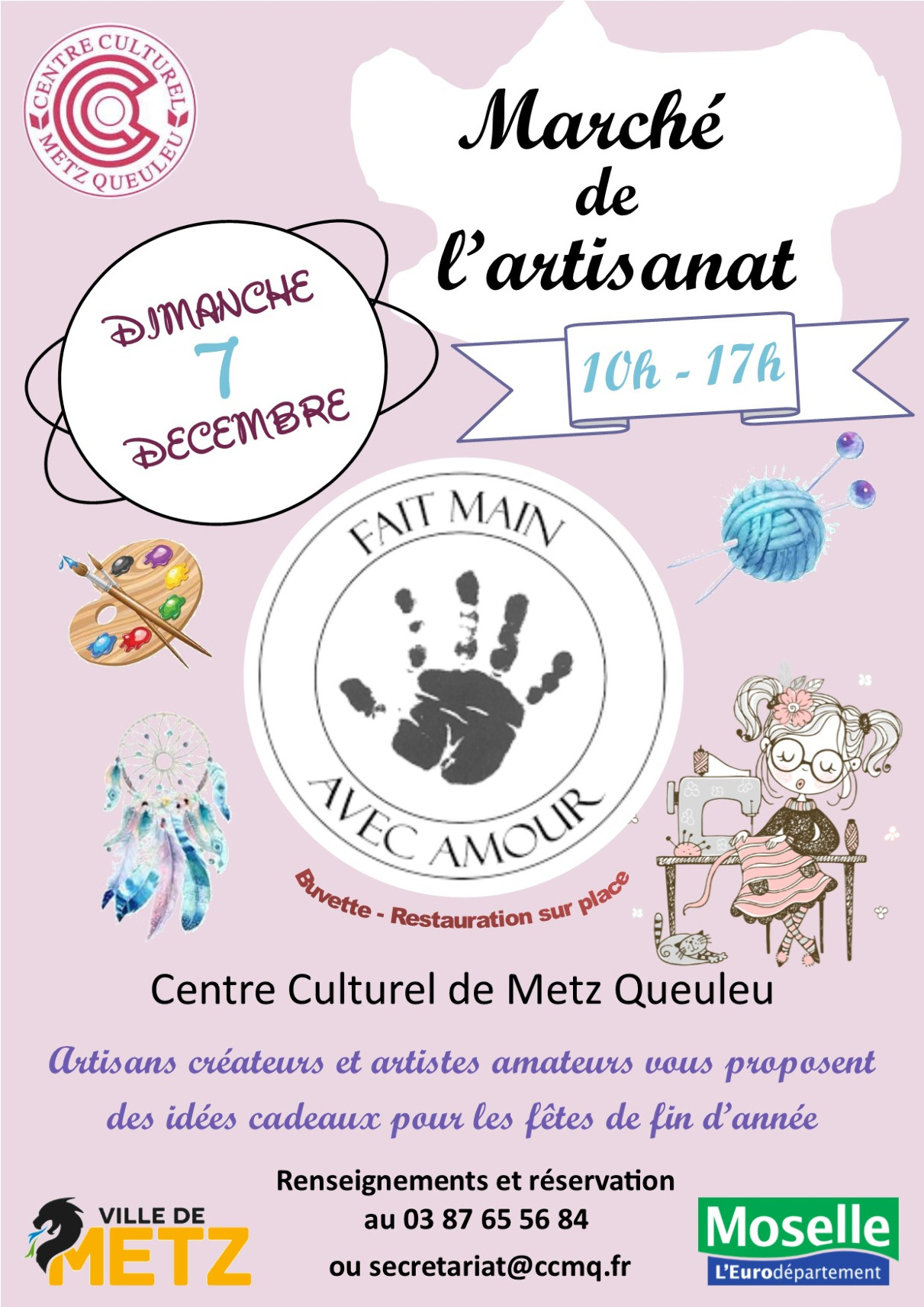 Pour les exposants : 5 € la table (1,20 x 0,70)Le Centre Culturel de Metz Queuleu propose son marché de l'artisanat.