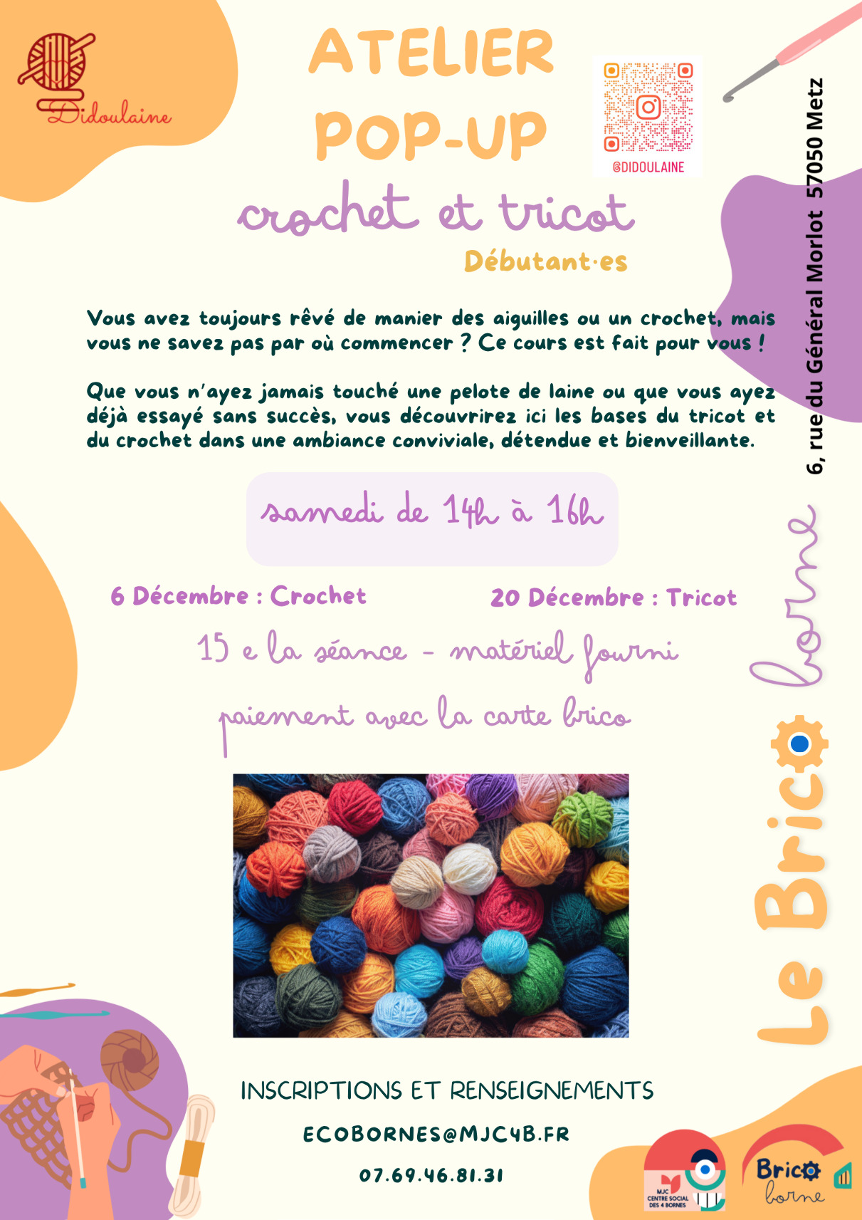 Que vous n’ayez jamais touché une pelote de laine ou que vous ayez déjà essayé sans succès, vous découvrirez ici les bases du tricot et du crochet dans une ambiance conviviale, détendue et bienveillante.