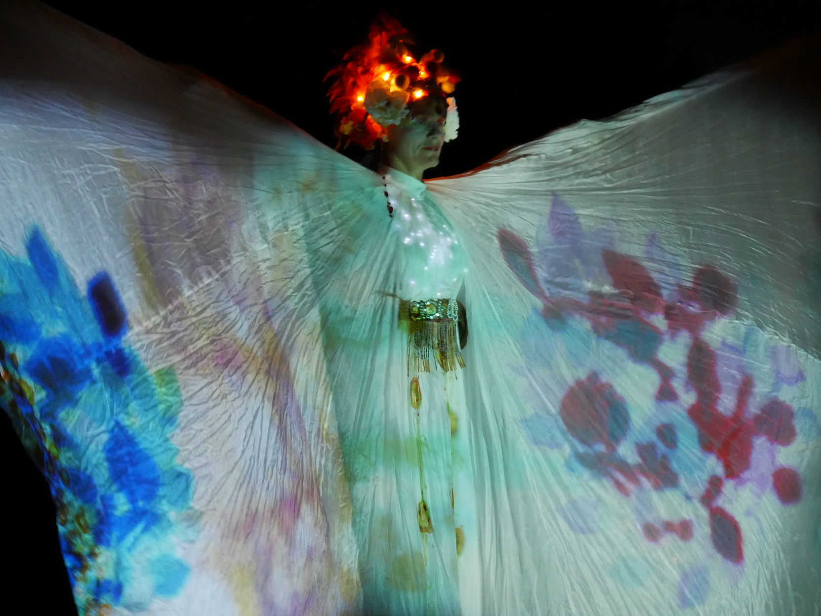 De l’infiniment grand à l’infiniment petit, sur échasses et au sol, les artistes vous convient à un voyage hors du temps. Un faiseur d’images projette des représentations d’ailes de soie en mouvement, qui apparaissent, disparaissent et se transforment, nous embarquant dans leur univers fascinant.