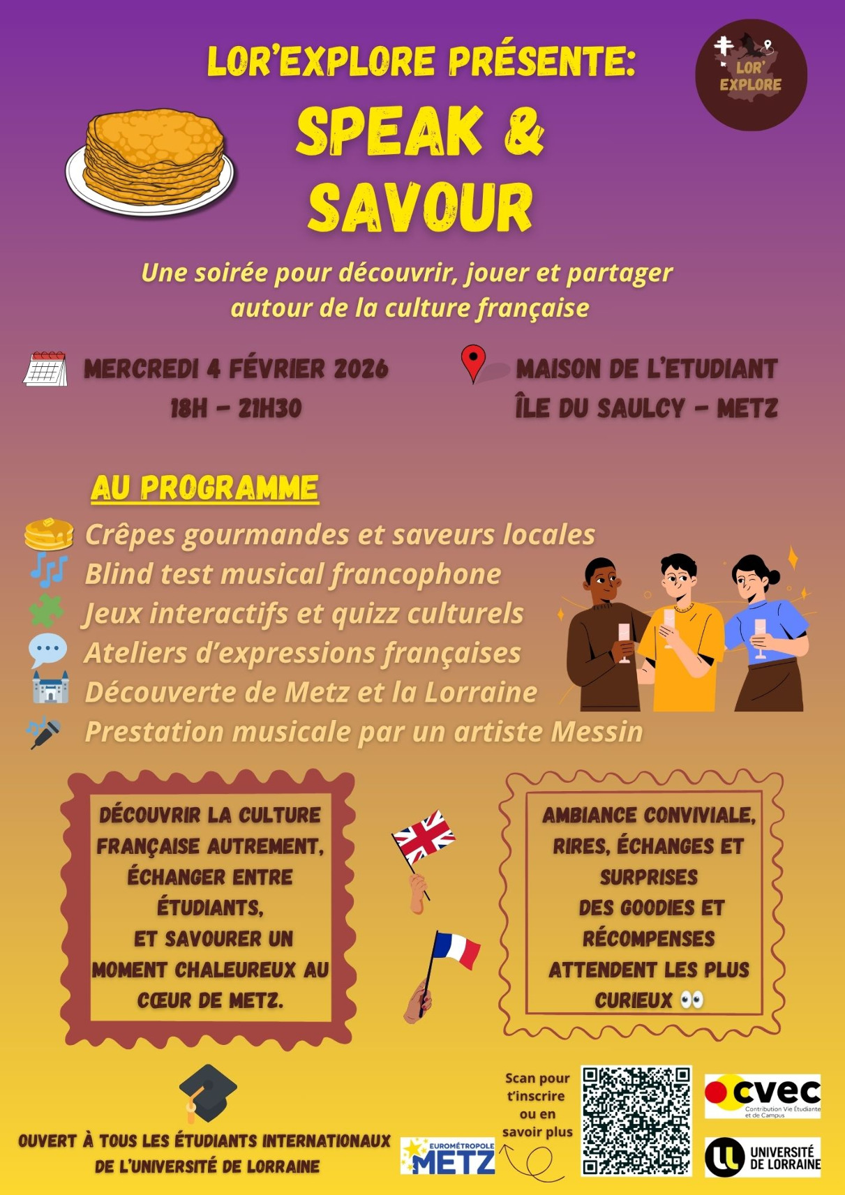 InscriptionLor’Explore Speak and Savor est un cycle de 6 soirées étudiantes gratuites, dédiées à la découverte du patrimoine culturel et gastronomique de Metz et de la Lorraine à travers des animations bilingues, des dégustations de spécialités locales et la rencontre avec musiciens et artisans du territoire. L’objectif principal est de stimuler l’intégration, l’inclusion, la convivialité et l’échange entre étudiants internationaux et français de toutes filières et tous campus en valorisant la richesse régionale.