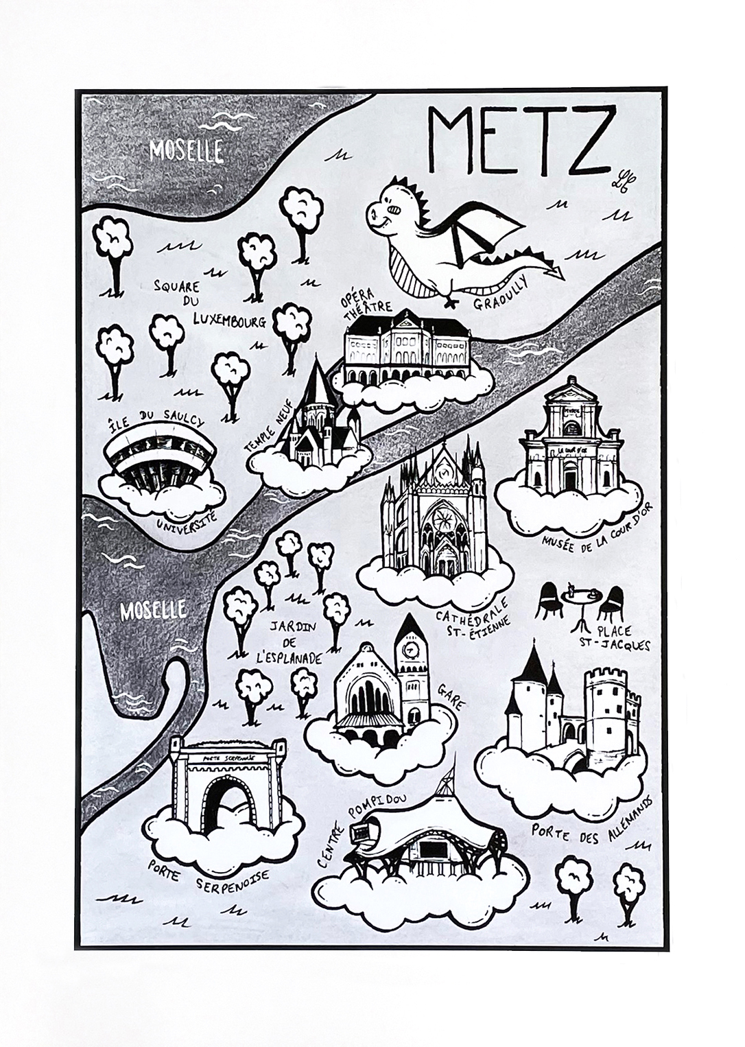 Avec l'artiste dessinatrice Lucie COLSON, imaginez votre propre version poétique ou futuriste de la ville de Metz dans cet atelier créatif pour les ados : des bâtiments emblématiques flottant sur des nuages, dans l’eau, perchés sur des collines imaginaires, suspendus à un ballon ou transformés en fusée…