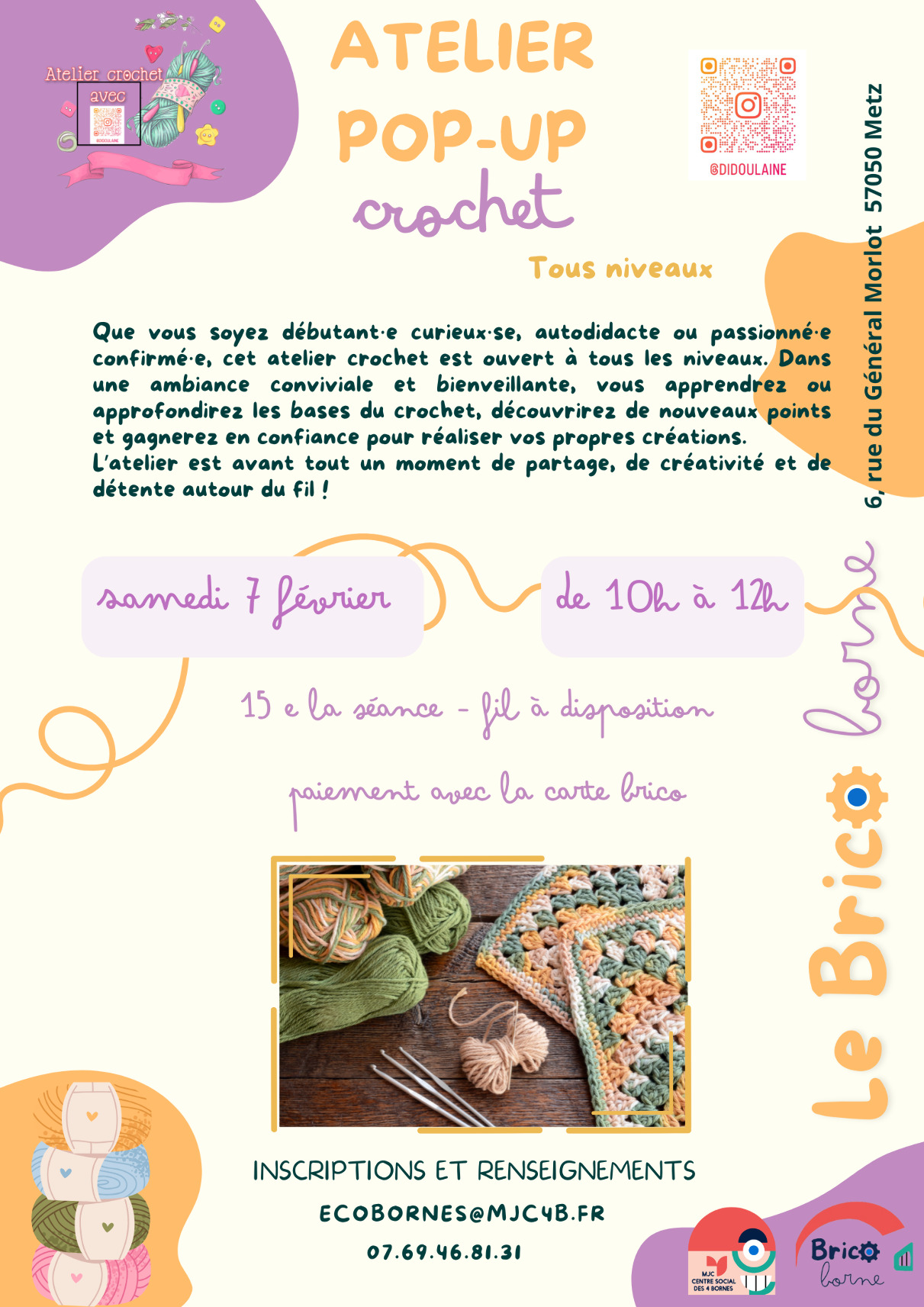Que vous soyez débutant(e) curieux(se), autodidacte ou passionné(e) confirmé(e), cet atelier crochet est ouvert à tous les niveaux.