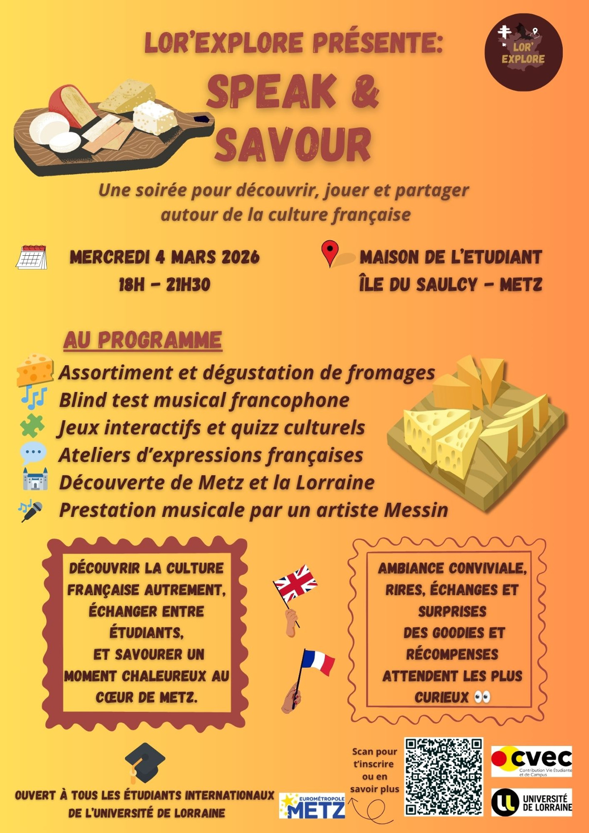 Buvette (boissons locales).Lor’Explore Speak and Savor est un cycle de 6 soirées étudiantes gratuites, dédiées à la découverte du patrimoine culturel et gastronomique de Metz et de la Lorraine à travers des animations bilingues, des dégustations de spécialités locales et la rencontre avec musiciens et artisans du territoire. L’objectif principal est de stimuler l’intégration, l’inclusion, la convivialité et l’échange entre étudiants internationaux et français de toutes filières et tous campus en valorisant la richesse régionale.