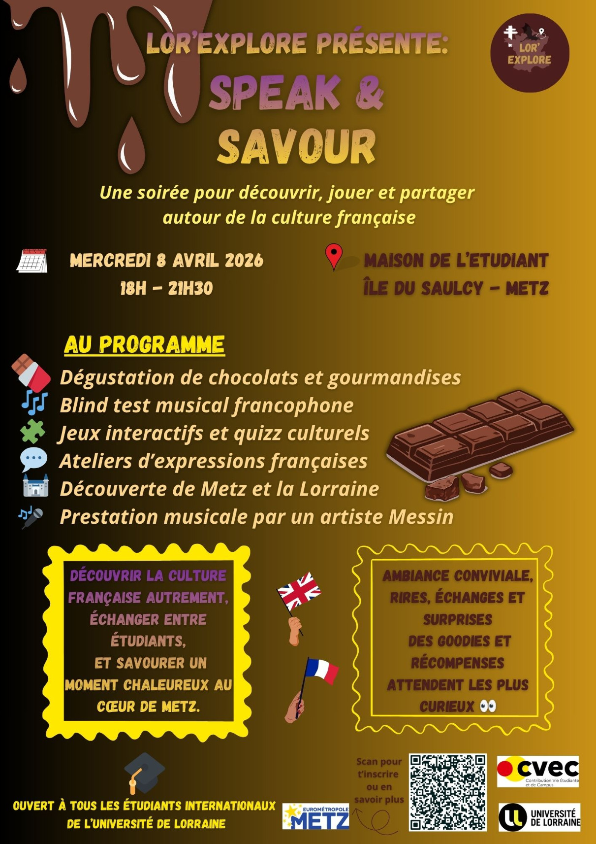 Buvette (boissons locales).Lor’Explore Speak and Savor est un cycle de 6 soirées étudiantes gratuites, dédiées à la découverte du patrimoine culturel et gastronomique de Metz et de la Lorraine à travers des animations bilingues, des dégustations de spécialités locales et la rencontre avec musiciens et artisans du territoire. L’objectif principal est de stimuler l’intégration, l’inclusion, la convivialité et l’échange entre étudiants internationaux et français de toutes filières et tous campus en valorisant la richesse régionale.
